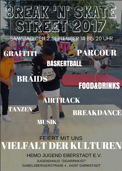 Die seit 1997 bestehende „ Break´N´Skaterstreet “ in Eberstadt veranstaltet die Hemo-Jugend Eberstadt nun zum 21. Mal. Die diesjährige Veranstaltung, unter dem Motto „Vielfalt der Kulturen“ wird mit Musik, Graffiti, Parcour, Basketball, Braids, Airbrusch Tattoo und HIP HOP Tanz vor dem Jugendhaus auf dem Schulhof der Gutenbergschule stattfinden.
