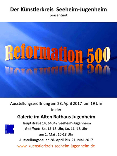 SEEHEIM-JUGENHEIM, April 2017 (meli), Der Künstlerkreis Seeheim-Jugenheim erarbeitete sich das Reformationsthema auf seine ganz eigene Weise, indem alle aktiven Künstler einzigartige Kunstobjekte und Bilder in den unterschiedlichsten Techniken und Materialien erstellten. Eine vielseitige Schau zum aktuellen Thema Reformation, die auch außerhalb religiöser Bindungen interessante Einblicke gewährt. Die Vernissage der Gemeinschafts–Ausstellung in der Galerie im Alten Rathaus zu Jugenheim, Hauptstraße 14 , Seeheim-Jugenheim beginnt am Freitag den 28.04.17 um 19 Uhr. Ausstellungsdauer bis 21.05.17. Weitere Öffnungszeiten sind jeweils samstags und feiertags von 15-18 Uhr und sonntags von 11 – 18 Uhr.
