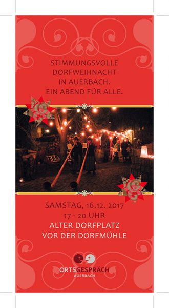AUERBACH, Dezember 2017 (meli), Zu drei festliche Stunden lädt „„Ortsgespräch Auerbach“ auf den Platz an der Dorfmühle ein Auerbach. Die Frauengruppe „Ortsgespräch Auerbach“ ist im Endspurt für die fast schon traditionelle Dorfweihnacht am 3. Adventsamstag. Für drei Stunden haben die Ladies ein weihnachtliches, musikalisches, kulinarisches und geselliges Programm geplant. Auf dem liebevoll festlich geschmückten Platz an der Auerbacher Dorfmühle werden am 16.12. zwischen 17 und 20 Uhr Chöre singen, Alphörner und Flöten erklingen und allerlei Leckereien zum Essen und Trinken angeboten.