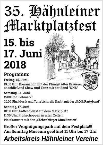 ALSBACH-HÄHNLEIN, Juni 2018 (raha), Ab Freitag, den 15. Juni geht es in Hähnlein wieder rund: Zum 35. Mal findet das traditionelle Marktplatzfest in der Ortsmitte des Dorfes statt. Der ausrichtende Arbeitskreis Hähnleiner Vereine erwartet zum Bieranstich durch die Pfungstädter Brauerei um 19 Uhr neben Bürgermeister Georg Rausch natürlich auch Gäste aus der Politik und die Delegation aus der ungarischen Partnergemeinde Diósd. Danach spielt auf der zentralen Bühne die altbekannte Band „DNS“ mit aktuellen und altbekannten Hits zum Tanz auf.
