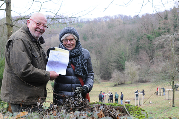Die Pflanzaktion wurde wesentlich durch Dr. Veronika Schlüter von der Stiftung Schloss Heiligenberg angestoßen, hier mit Peter Tränklein und dem Original der alten Liste der historischen Apfelsorten. Foto: ewiÄpfel wie auf Omas Wiese