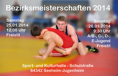 SEEHEIM-JUGENHEIM, Januar 2014 (meli), Unter der Schirmherrschaft von Bürgermeister Olaf Kühn werden am kommenden Wochenende in der Seeheimer Sport- und Kulturhalle die Bezirksmeisterschaften im Ringen (Freistil) ausgetragen. Am Samstag, den 25.01.2014, ermitteln ab 12.00 Uhr die Männer ihre Meister. Die Jugend geht dann am Sonntag, den 26.01.2014, ab 9.30 Uhr auf die Matte.