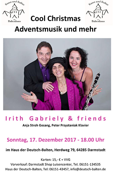DARMSTADT, November 2017 (meli), Sie hören zum einen klassische Musik zur Advents- u. Weihnachtszeit zum anderen leichte, fetzige, verjazzte Christmas Songs, bearbeitet und veröffentlicht vom Pianisten Peter Przystaniak, außerdem Gospels und zusätzlich – da das jüdisches Lichterfest in diese Zeit fällt – jüdische Musik zum Chanuka-Fest. Irith Gabriely führt wie immer auf humorvolle Weise durch das Programm. Das Konzert findet am 17. Dezember 2017 um 18.00 Uhr im Haus der Deutsch-Balten Herdweg 79, Darmstadt statt.