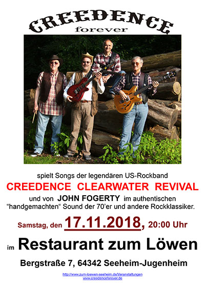 Leute mit gleicher Leidenschaft sollten sich den 17. November vormerken. Dann nämlich werden im Restaurant „Zum Löwen“, Bergstraße 7, 64342 Seeheim-Jugenheim wieder einmal all diese Hits zum Leben erweckt. Ab 20 Uhr heißt es dann „Creedence forever“ – wenigstens für ein paar Stunden. Die aus dem Dieburger/Darmstädter Umland kommende CCR-Formation „Creedence forever“ präsentiert CCR im unvergesslichen und zeitlosen, handgemachten Sound mit Originalinstrumentierung wie z.B. Saxophon, Akustikgitarre und Bluesharp und selbstverständlich den soundbringenden E-Gitarren. Damit nicht genug: wenn nämlich von CCR die Rede ist, dann darf John Fogerty nicht fehlen. Dieser Sänger, Komponist und CCR-Frontmann hat auch als Solist viele Erfolge eingeheimst. Und so erklingen am 17. November natürlich dessen Solo-Hits wie z.B. „Rockin’ all over the world“ und andere Rockklassiker aus dieser Zeit.