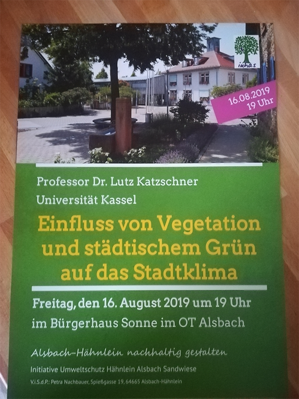 Am Freitag, den 16.8.2019 im Bürgerhaus Sonne lädt die IHUAS Alsbach-Hähnlein herzlich ein zu einem hochinteressanten Vortrag zu all diesen Themen! Informieren Sie sich aus erster Hand bei einem Experten – tauschen Sie sich aus – treffen Sie Politiker, die jeden Tag klimarelevante Entscheidungen treffen! Wir freuen uns auf Ihren Besuch, auf kalte Getränke und heiße Diskussionen! Referent Professor Dr. Lutz Katzschner ist Meteorologe und Professor für Umweltmeteorologie im Fachbereich Architektur und Stadtplanung. Er ist Arbeitskreissprecher des AK Luft im BUND. Sein Schwerpunkt ist die angewandte Meteorologie bezüglich der Human-biometeorologie und der Auswirkungen des Klimawandels incl. der Lufthyhiene. Seit 1983 ist er Leiter des Fachgebiets mit Projekten zur Stadtklimatologie.