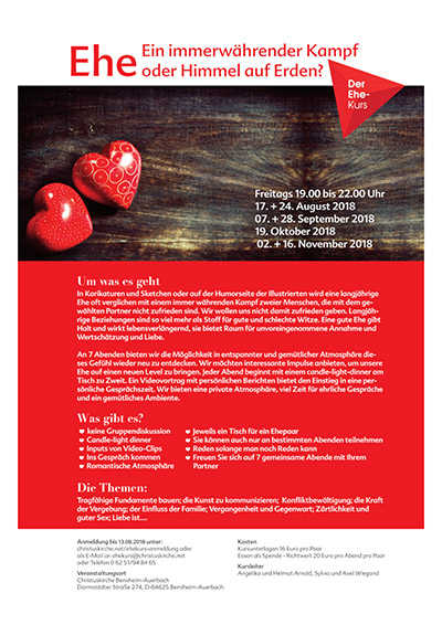 Der nächste Ehekurs startet am Freitag den 17.08.2018 um 19:00 Uhr. Nähere Informationen erhalten Sie unter www.christuskirche.net oder unter der Rufnummer: 06251 / 948465. Der Veranstaltungsort ist die Christuskirche in Bensheim-Auerbach.