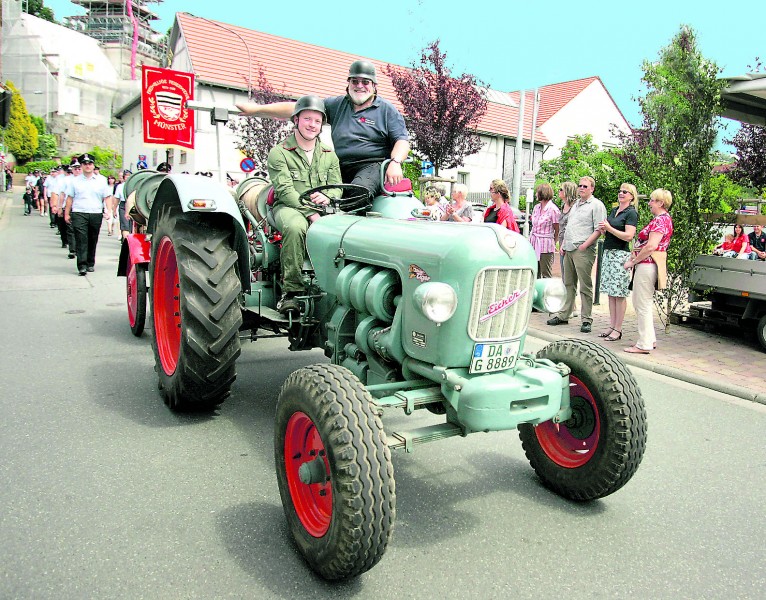 Mit einem historischen Traktor waren die Kameraden der Seeheimer Wehr zum Jubiläumsumzug ausgerückt.Fotogalerie: