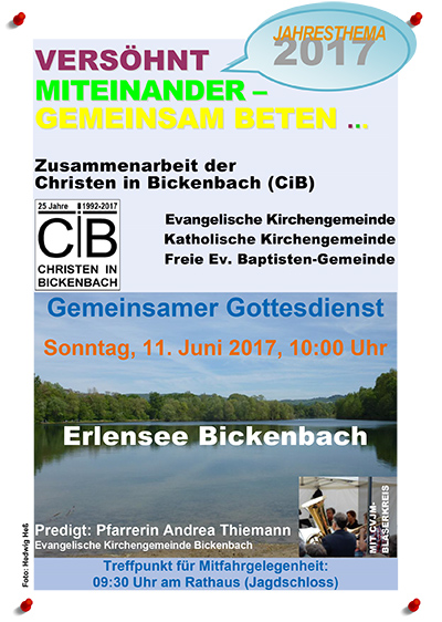 Der Arbeitskreis „Zusammenarbeit der Christen in Bickenbach“ besteht aus einer Gruppe von Mitglie-dern der drei Bickenbacher Kirchengemeinden (Evangelische und katholische Kirchengemeinde, Freie Evangelische Baptistengemeinde). Er will unter Wahrung der jeweiligen Prägungen der beteiligten Kon-fessionen die Gemeinsamkeiten hervorheben. Er besteht in diesem Jahr seit 25 Jahren. Im Kontext dieses Jubiläums und des 500-jährigen Reformationsgedenkens steht der Gottesdienst unter dem Thema „Versöhnt miteinander – gemeinsam beten“. Eine gute Gelegenheit für alle, die nicht so gern zur Kirche kommen, mal wieder Gottesdienstluft zu schnuppern.
