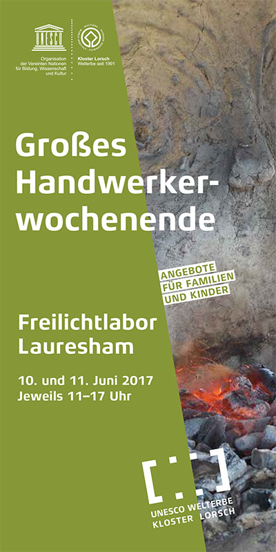 LORSCH, Mai 2017 (meli), Am Samstag, 10. und Sonntag, 11. Juni dreht sich im Freilichtlabor Lauresham alles rund um das Thema Handwerk im Frühmittelalter. Über zwanzig verschiedene Handwerke sind an diesem Wochenende zu Gast in Lauresham – vom Schmieden über die Pergamentherstellung und das Färben bis hin zu Lehmbau und Weben. Aber auch ausgefallene Tätigkeiten wie Knochenflötenherstellung, Netzknüpfen und die Verarbeitung von Lebensmitteln geben spannende Einblicke in das Alltagsleben unserer Vorfahren zur Zeit Karls des Großen.