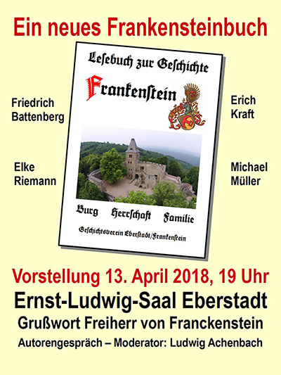 EBERSTADT, März 2018 (meli), Der Geschichtsverein lädt zur Vorstellung seines neu erschienenen Buchs mit Bildpräsentation und Autorengesprächen am 13. April um 19 Uhr in den Ernst-Ludwig-Saal in Darmstadt-Eberstadt, Schwanenstraße 42, ein. Bald 50 Jahre ist es her, daß der verdiente Heimatforscher und langjährige Pfarrer Wolfgang Weiß-gerber ein Buch über die Geschichte von Burg und Familie Frankenstein geschrieben hat. Inzwischen ist die wissenschaftliche Forschung freilich weitergegangen. In langjähriger Arbeit konnte der Geschichtsverein Eberstadt/Frankenstein viele neue Erkenntnisse zusammentragen. Er legt nun ein „Lesebuch zur Frankensteiner Geschichte“ vor, nachdem bereits im letzten Jahr das „Lesebuch zur Eberstädter Geschichte“ auf großen Zuspruch stieß.