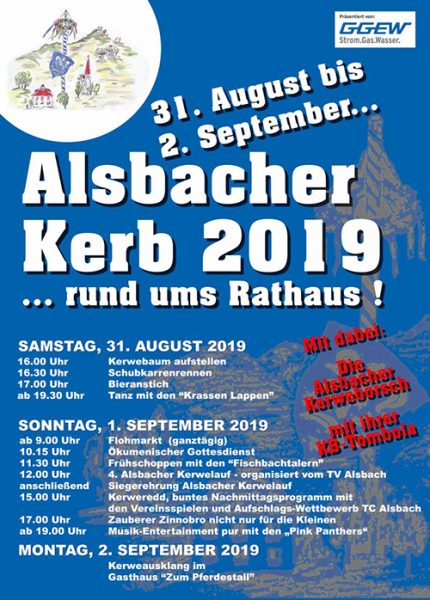 ALSBACH-HÄHNLEIN, August 2019 (meli), Wieder ist ein Jahr vergangen und schon bald können wir die Alsbacher Kerb „Rund ums Rathaus“ feiern. Die Vorbereitungen laufen schon seit einiger Zeit und alle beteiligten Vereine mit ihren aktiven Mitgliedern sind am organisieren und planen. Vieles muss im Vorfeld überlegt und rechtzeitig besorgt werden, viele Stunden und Energie bringen die Vereinsmitglieder ein, um wieder ein tolles Fest für den Ort auf die Beine zu stellen. Jeder, der schon einmal Veranstaltungen organisiert hat, wird nachvollziehen können, wie viel eigenes Engagement dahintersteckt. In diesem Sinne möchten wir all den Menschen danken, die es möglich machen, jedes Jahr die Alsbacher Kerb feiern zu können.