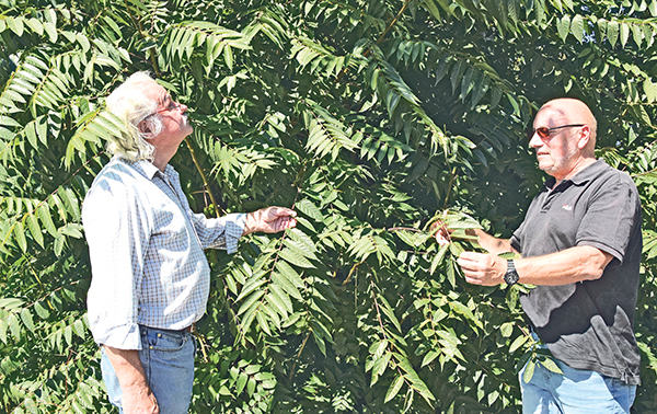 Karl Rechel (li.)und sein Clubkollege Gerhard Dentler begutachten das wuchernde Grün mit Sorge. Foto: ps