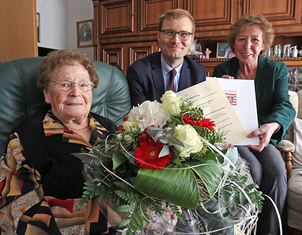 Die älteste Bürgerin der Gemeinde Alsbach-Hähnlein ist Franziska Bonin (li.). Zu ihrem 100. Geburtstag Anfang November überbrachten Bürgermeister Sebastian Bubenzer (mi.) und Kreisausschuss Mitglied Doris Hofmann (re.) die Glückwünsche der Gemeinde und des Landrates. Foto: soe