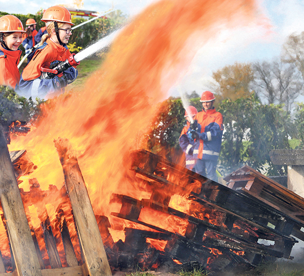 Zur Überraschung der Kids loderte ein echtes riesiges Feuer auf dem Gelände des Hofes der Firma Wendel in Zwingenberg. Unter der Leitung der Einsatzführer baute man schnell die Wasserversorgung auf und ein startete den erstern Löschangriff. Foto: soe