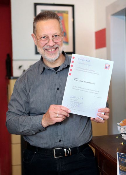 Karl Gerd „Charly“ Zimmermann freut sich über den Ehrenbrief des Landes Hessen. Foto: soe