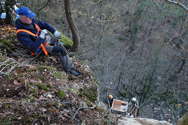 Mit Hilfe von Kletterern von der FF Seeheim hat der NABU Seeheim-Jugenheim im Steinbruch Erlenbruch bei Alsbach einen zerstörten Falkenkasten ersetzt. Foto: Tino Westphal