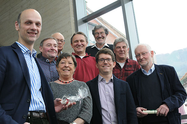 Peter Jankowski (re) verabschiedete sich auch von seiner zuverlässigen Mannschaft der Kläranlage (mittlere Reihe v.li.): Betriebsschlosser Lothar Müller, Elektriker Velimir Löser und Betriebsleiter Hans-Jürgen Frank. Foto: ewi