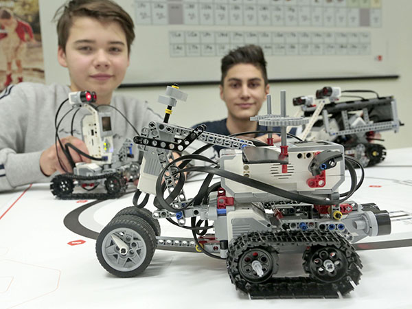 In ihrem LEGO-Projekt haben Dario Unali (li.) und Robert Vrataric (re.) einen Roboter selbst gebaut und programmiert. Foto: soe