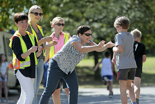 Endlich eine Erfrischung für die tapferen Läufer. Dafür sorgten die Lehrerinnen an der Wasser-Station. Foto: soe