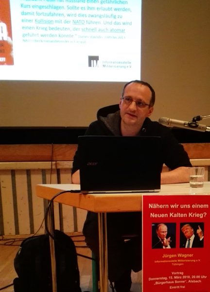 ALSBACH-HÄHNLEIN, März 2018 (meli), Mit dieser Fragestellung hatte die Arbeitsgruppe Frieden Alsbach-Hähnlein am 15. März ins Bürgerhaus in Alsbach eingeladen. Vor ca. 60 Zuhörerinnen und Zuhörern referierte der Tübinger Historiker und Politikwissenschaftler Jürgen Wagner von der „Informationsstelle Militarismus“ zu o.g. Fragestellung. mehr »