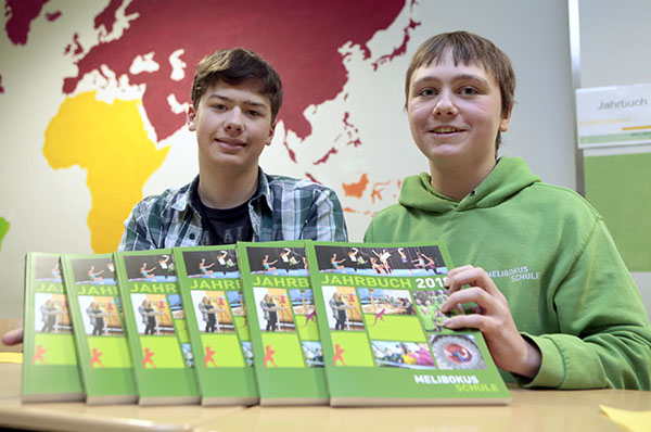 Silas Koch und Alexander Leuchter präsentieren stolz das neue Jahrbuch 2018, das im WPU-Kurs „Schuljahrbuch“ entstanden ist. Foto: soe