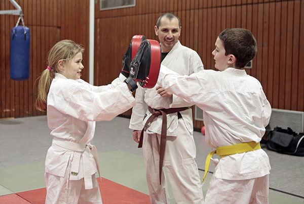 Trainer Domenico Tammone übt hier mit der Kindergruppe verschiedene Schlagtechniken. Foto: soe