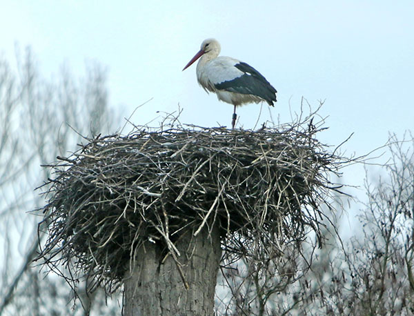 Um die Mittagszeit trifft man die Weißstörche meist auf ihren Nestern. Entweder auf dem Mast an der Gänsweide oder auf den abgebrochenen Schwarzerlen auf dem Betonweg durch die Fasanenlache in Hähnlein. Foto: soe