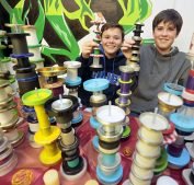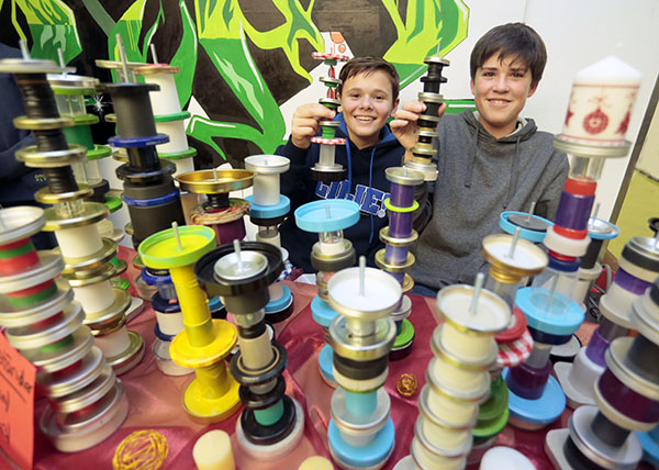 Witzige, bunte selbstgebastelte Kerzenständer aus ihrem Upcycling-Projekt boten Colin und Aaron den Besuchern an ihrem Stand. Foto: soe