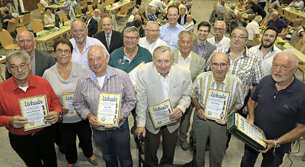 Ehrungen für 25-jährige und 50-jährige Vereinszugehörigkeit sowie die Ernennung zu Ehrenmitgliedern wurden beim Festkommers des Vogelzucht- u. Schutzvereins Hähnlein ausgesprochen. Foto: soe