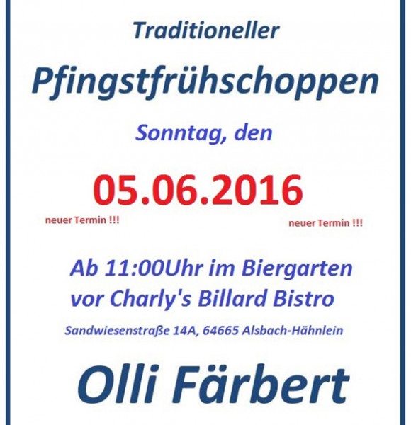 ALSBACH-HÄHNLEIN, Mai 2016 (meli), Aufgrund der sehr schlechten Wetterprognosen, gepaart mit niedrigen Temperaturen hat der Vorstand der Hutzelschweizer, in Abstimmung mit dem Bürgermeister, das Pfingstfest verschoben. Das Pfingstfest wird nun am 05.06.2016 ab 11.00 Uhr im Biergarten vor Charly’s Billard Bistro in der Sandwiesenstraße 14a, 64665 Alsbach-Hähnlein stattfinden. Ebenfalls begleitet mit Live Musik durch Olli Färbert.