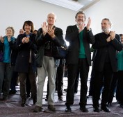 Viel Beifall gab es bei der Feierstunde zur Einweihung der neuen Gymnastikhalle von den Gästen, Alsbach-Hähnleins Bürgermeister Georg Rausch (mi.) und dem Kreisbeigeordneten Christel Fleischmann (re.). Foto: soe