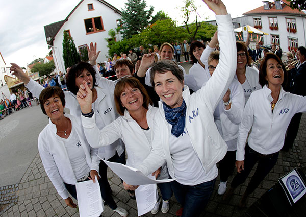 Die singfreudigen Gäste des „Singens unter der Linde“ und Knud Seckel (li.) haben sich am ev. Gemeindehaus in Alsbach getroffen und aus vollem Herzen gesungen. Foto: soe