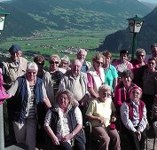 Ein Teil der Reisegruppe an der sog. „Kanzelkehre“ mit Blick ins Inn- und Zillertal; dabei auch die ältesten Teilnehmer, Johannes Benkert (92) und Irmgard Götz (90) .