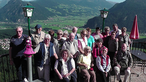 Ein Teil der Reisegruppe an der sog. „Kanzelkehre“ mit Blick ins Inn- und Zillertal; dabei auch die ältesten Teilnehmer, Johannes Benkert (92) und Irmgard Götz (90) .