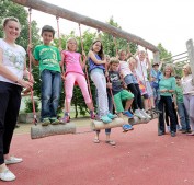 Das beliebte Spielgerüst mit Schaukeln und Kletterstangen wurde mit einem neuen weichen Fallschutz, einem roten Tartanboden, ausgestattet. Foto: soe