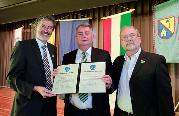 Ihre seit 25 Jahren bestehende Partnerschaft erneuert haben die Bürgermeister der beiden Gemeinden Georg Rausch (li) und Geza Speth (re), der nun auch Ehrenbürger von Alsbach-Hähnlein ist. Foto: soe