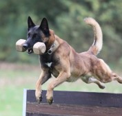 Toro zeigt ein fehlerfreies Apportieren über eine Hürde.