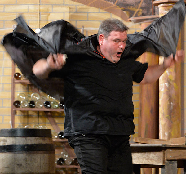 Max (Michael Nickels) wirbelt als verkleideter Vampir auf der Bühne rum und erschreckt die arme Tina.