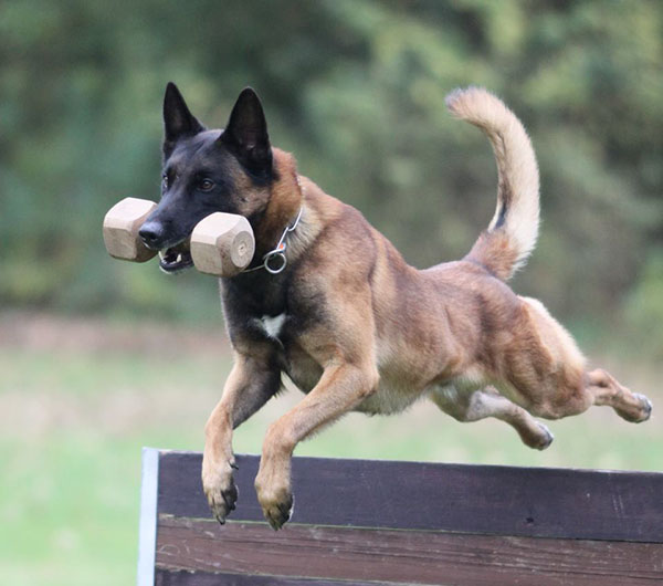 Toro zeigt ein fehlerfreies Apportieren über eine Hürde.