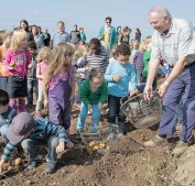 Mit Begeisterung stürzten sich die Kinder auf die Kartoffeln, Helmut Bernhard vom Alsbach-Hähnleiner Museumsverein gibt noch ein paar Tipps zur Lese. Foto: Stefan Oelsner