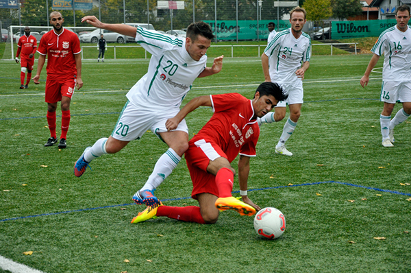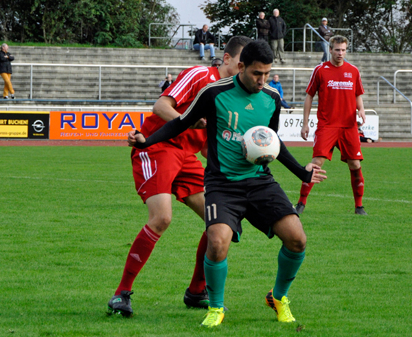 Bayram Caylak schirmt den Ball vor seinem Gegenspieler von der SpVgg.Neu-Isenburg ab.