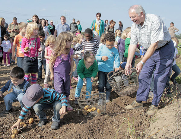 Mit Begeisterung stürzten sich die Kinder auf die Kartoffeln, Helmut Bernhard vom Alsbach-Hähnleiner Museumsverein gibt noch ein paar Tipps zur Lese. Foto: Stefan Oelsner
