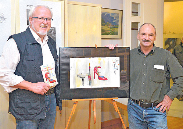 Ausstellung und Lesung im Alsbacher Bürgerhaus Sonne. Jürgen Becker (re) hat den Buchtitel für Helmut Roths (li) Buch „Ich wünscht´, ich wär´ Dein Swimming Pool“ gestaltet. Foto: Berno Nix