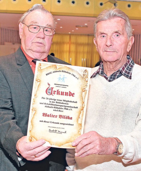 Geehrt für seine 20jährige treue Mitgliedschaft in der Behinderten- und Rehabilitationssportgemeinschaft Alsbach-Hähnlein wurde Walter Bilska (re.) im Rahmen der Wehnachtsfeier des Vereins.