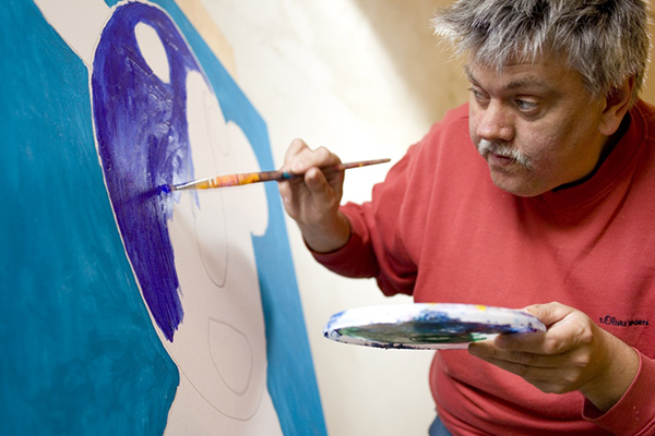 Jürgen Klaban hat sich im Rahmen seiner Kunst stets weiterentwickelt. Er arbeitet seit 8 Jahren innerhalb der Werkstatt als Vollzeit-Maler.