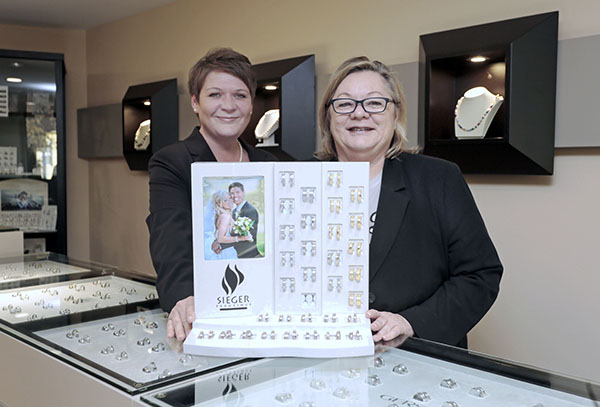 Vom schlichten Goldring bis zum extravaganten Ehering mit Diamantbesetzung. Die beiden Fachverkäuferinnen Regina Fuchs und Patricia Steinmetz (v.li.) präsentieren über 2000 unterschiedliche Modelle den Paaren. Foto: soe