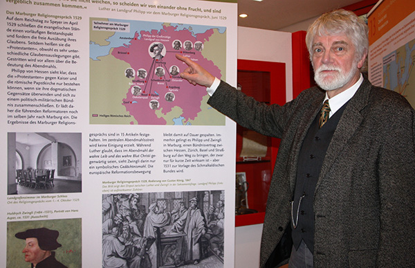 Walter Fleischmann-Bisten vor der Schautafel zum Marburger Religionsgespräch.