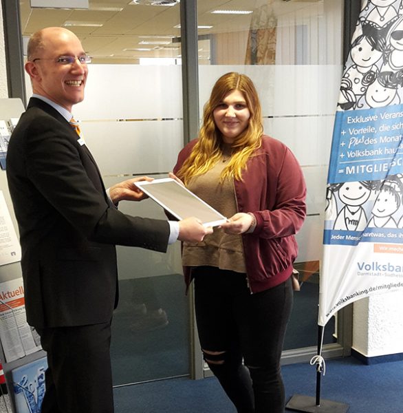 DARMSTADT/AUERBACH, Februar 2017 (meli), Große Freude in Bensheim-Auerbach – bei einer bundesweiten Verlosungsaktion fiel das Los auf Anna Jackstein, die ab sofort ein hochwertiges iPad Pro ihr Eigen nennen kann. Berater Reiner Dürr übergab das “Kultteil” an die glückliche Gewinnerin. Die Auerbacherin Anna Jackstein nahm im vergangenen Jahr am paydirekt-Gewinnspiel “Slotmaschine” teil und wurde als eine der Hauptgewinnerinnen ermittelt. mehr »