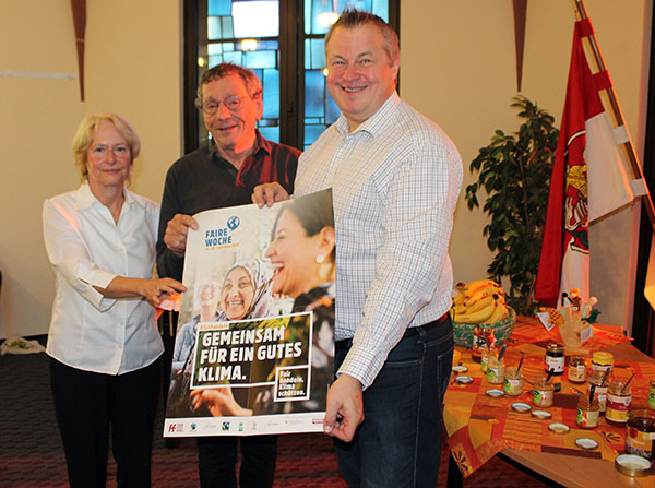 Gerlinde Rühlmann und Dr. Thomas Götz (Mitte) von der Steuerungsgruppe Fairtrade-Stadt Bensheim mit Bürgermeister Rolf Richter.