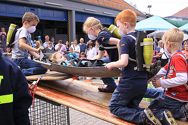 Das Bild zeigt die Minigruppe an einem THW-Familientag bei der Vorführung „Rettung einer verletzten Person unter Atemschutz“.